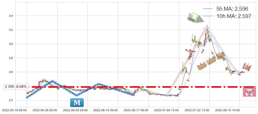 ♘ 支撑价格位2.390,可信任强度95.53%,距离最后交易2022-08-12 14:00形成的收盘价格2.600相差 -8.08%