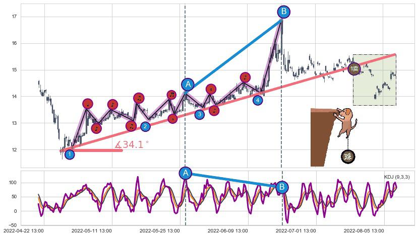 从2022-08-02 14:00至2022-08-12 14:00,共包含15个小时,阶段股价上涨6.47%,阶段股价变动位移路程比: 1 : 2
