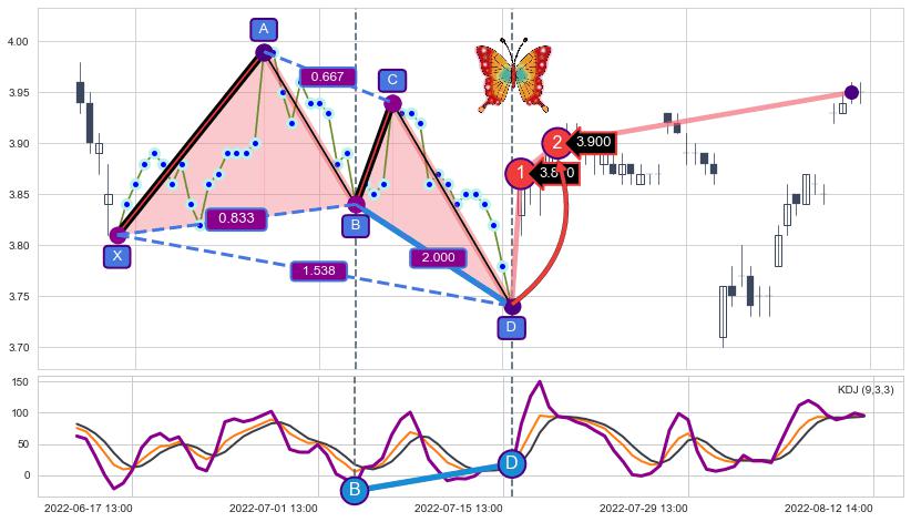 ➣ 已完成【蝴蝶】形态起点X: 06-17:10, 终点D: 07-15:14, 共44交易小时