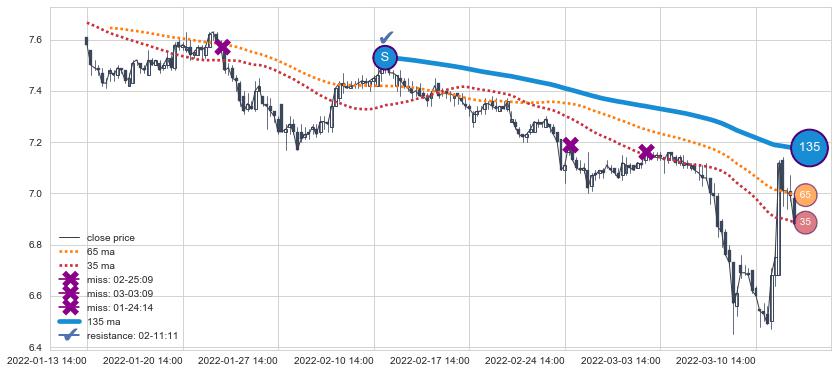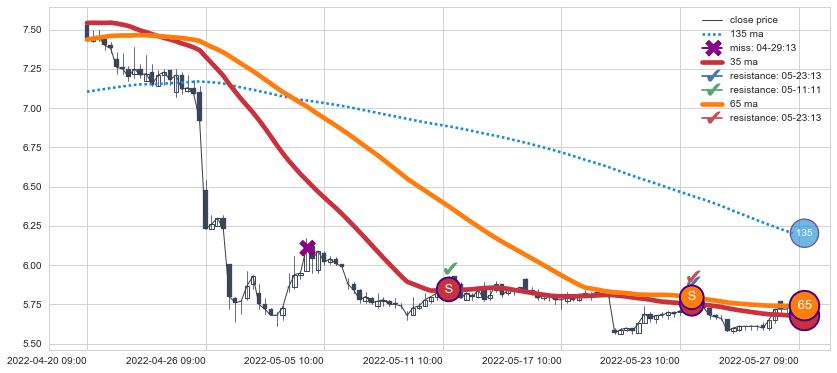 下跌趋势04-20 09:00-05-27 09:00,均线65, 35确认关键阻力2处
