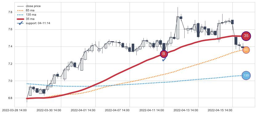 上涨趋势07-07 14:00-07-22 14:00,均线135确认关键支撑1处