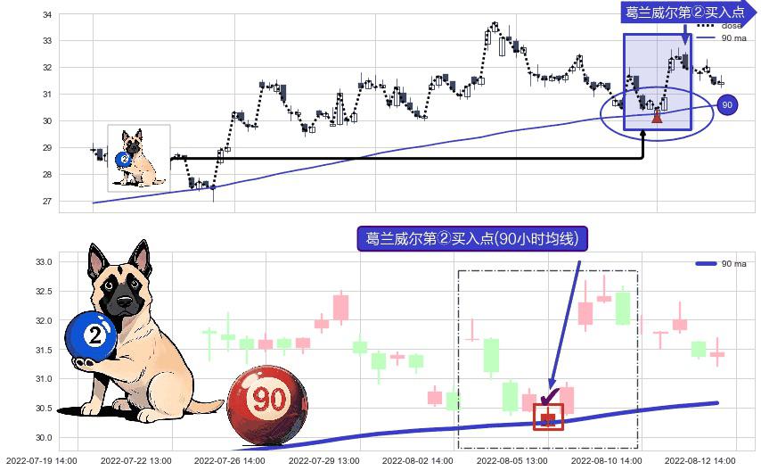 形态多维评估: ⚀ 2022-08-05 13:00:00-小时显现 葛兰威尔均线 90小时均线 第②买入点 上升趋势的中继信号,后市看涨,买进信号