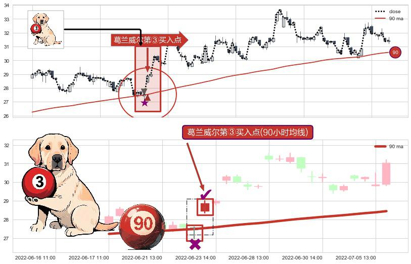 形态多维评估: ⚀ 2022-06-23 13:00:00-小时显现 葛兰威尔均线 90小时均线 第③买入点 上升趋势的中继信号,后市看涨,买进信号