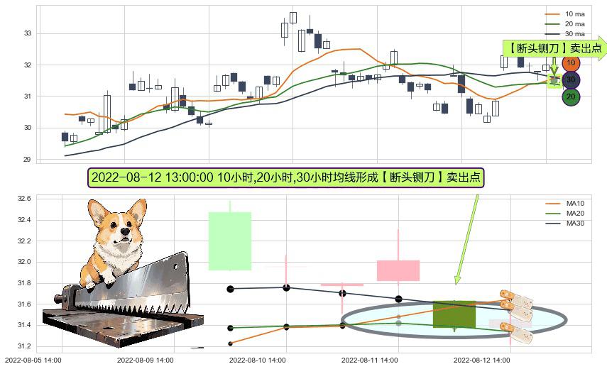 形态多维评估: ⚀ 2022-08-12 13:00:00小时显现 10小时-20小时-30小时均线 【断头铡刀】卖出点 看空信号,后市看跌,卖出