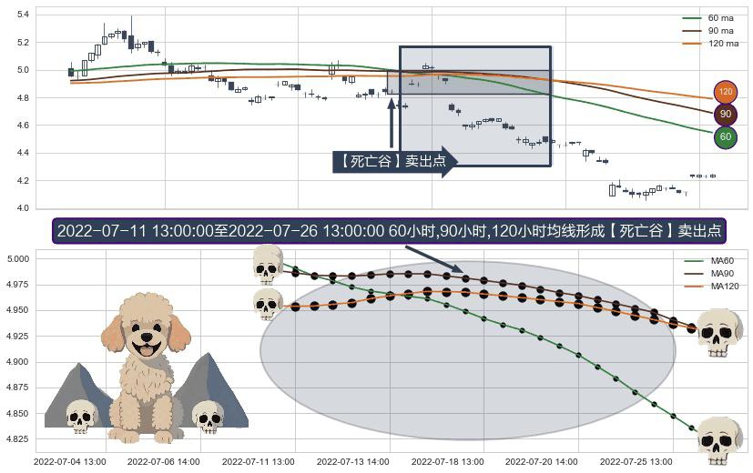 形态多维评估: ⚀ 2022-07-11 14:00:00-小时至2022-07-26 13:00:00-小时显现 60小时-90小时-120小时均线 【死亡谷】卖出点 看空信号,后市看跌,卖出