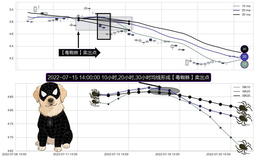 形态多维评估: ⚀ 2022-07-15 14:00:00小时显现 10小时-20小时-30小时均线 【毒蜘蛛】卖出点 看空信号,后市看跌,卖出