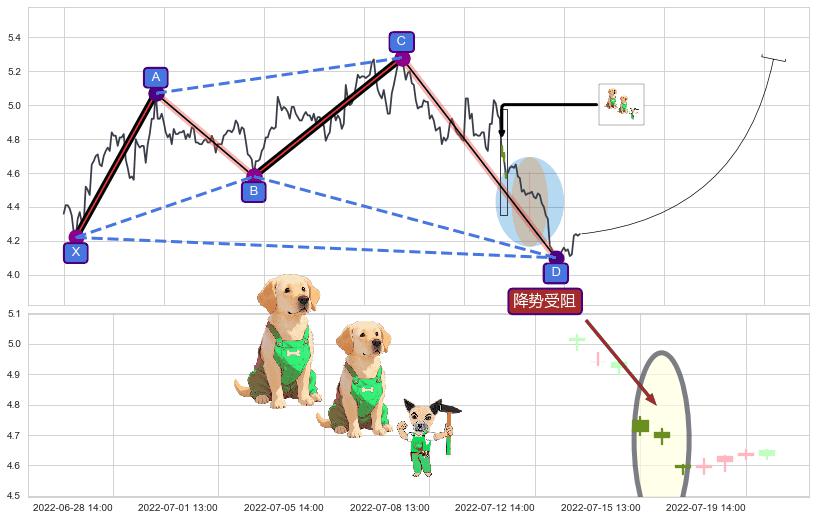 2022-07-01: 时域附近第一阻力位4.70持续的对下跌趋势进行阻拦,有效地放缓了下跌的速度。