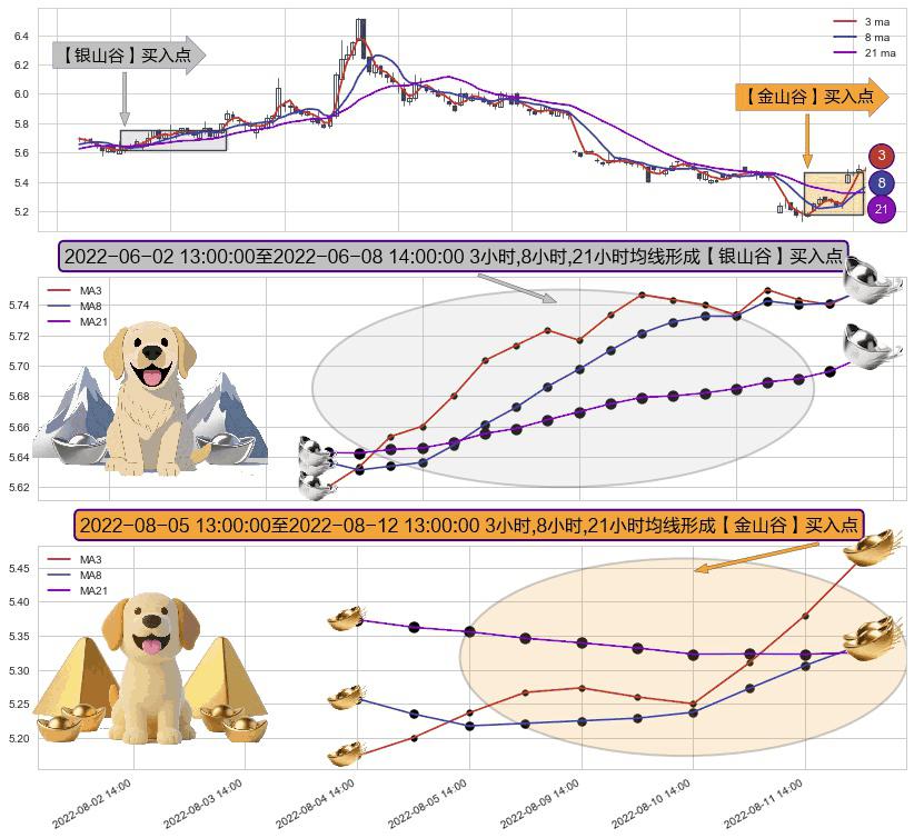 ⚄ 2022-08-05 14:00:00-小时至2022-08-12 13:00:00-小时显现 3小时-8小时-21小时均线 【金山谷】买入点 其再次确认了买入信号,可靠性更强,买入