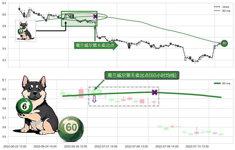 ⚀ 2022-06-29 14:00:00-小时显现 葛兰威尔均线 60小时均线 第⑥卖出点 走势反转见顶信号,后市看跌,卖出信号