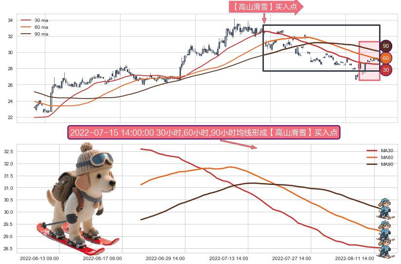 ⚀ 2022-06-20 14:00:00小时-2022-08-12 14:00:00小时显现 30小时-60小时-90小时均线 【高山滑雪】买入点 看多信号,后市看涨,买入