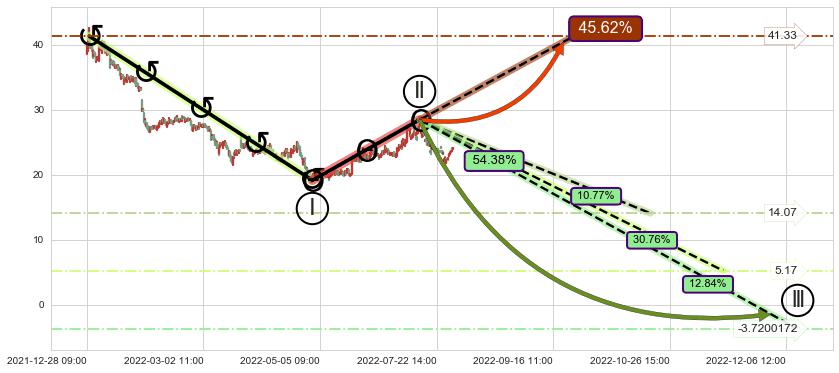 从2021-12-28 14:00至2022-05-23 14:00,共包含457个小时,阶段股价下跌-56.24%,阶段股价变动位移路程比: 1 : 7,下跌趋势角度: 51.5