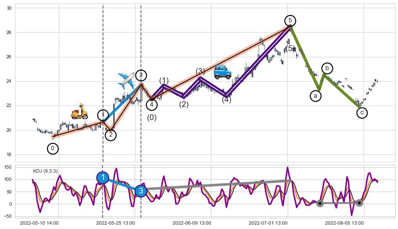 ➣ 第一, 三驱动浪端点:【KDJ】走势出现【常规背离 & 反转信号】背离程度81.37%,背离夹角角度123.0˚,背离程度较大