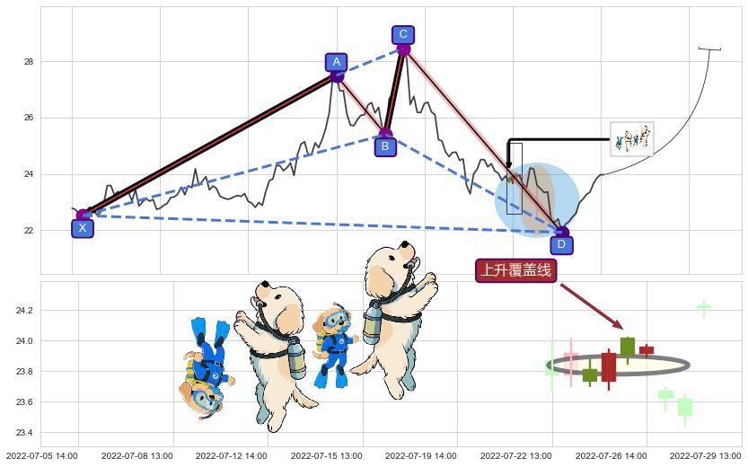 | 2 🅚:【烘云托月】买入点 ➕ 📡:谐波鲨鱼已到达d点:猜想c下行到达d点后报复性拉升上涨(均值回复) ☞ 看多信号 ⇥ 【均线】交织【图形】⇥ 综合量化分数: 60 | > |