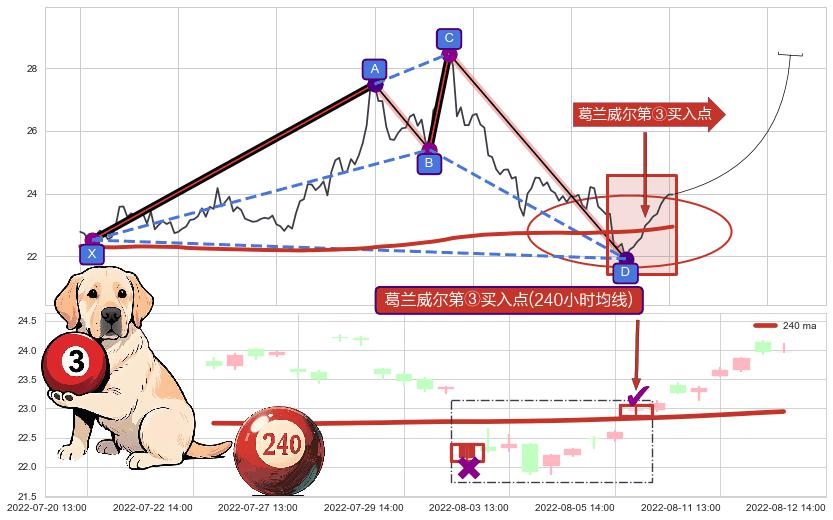 从2022-07-04 13:00至2022-08-03 14:00,共包含46个小时,阶段股价下跌-25.42%,阶段股价变动位移路程比: 1 : 2