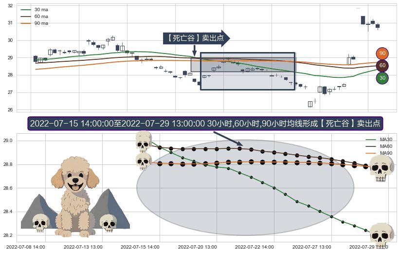 形态多维评估: ⚀ 2022-07-18 13:00:00-小时至2022-07-29 13:00:00-小时显现 30小时-60小时-90小时均线 【死亡谷】卖出点 看空信号,后市看跌,卖出