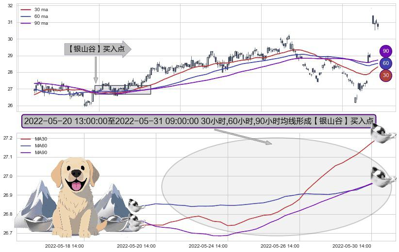 形态多维评估: ⚀ 2022-05-20 14:00:00-小时至2022-05-31 09:00:00-小时显现 30小时-60小时-90小时均线 【银山谷】买入点 看多信号,后市看涨,买入