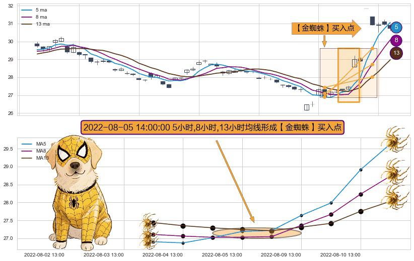 形态多维评估: ⚀ 2022-08-05 14:00:00小时显现 5小时-8小时-13小时均线 【金蜘蛛】买入点 看多信号,后市看涨,买入