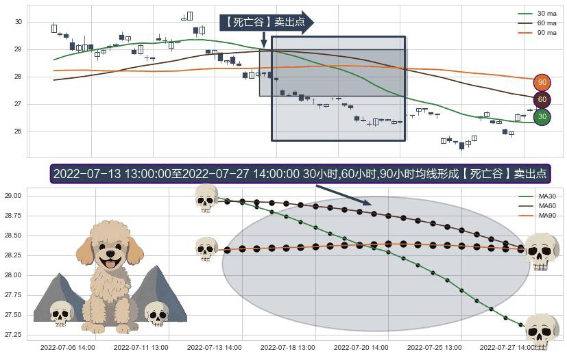⚀ 2022-07-13 14:00:00-小时至2022-07-27 14:00:00-小时显现 30小时-60小时-90小时均线 【死亡谷】卖出点 看空信号,后市看跌,卖出