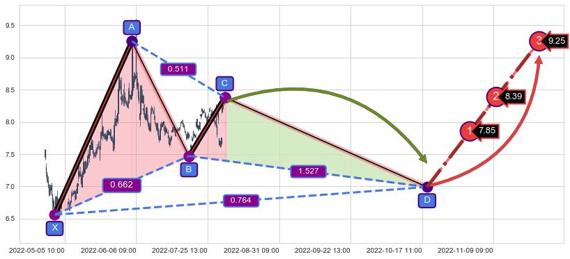 ➢ 距离预测D点位置有足够的下跌空间, 与看涨【伽利】形态相反,实际方向【看跌】