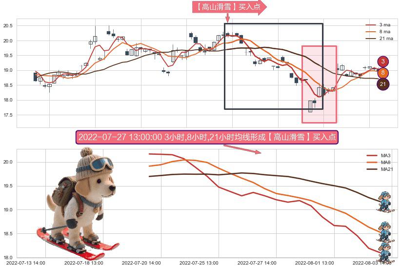⚀ 2022-07-20 13:00:00小时-2022-08-03 13:00:00小时显现 3小时-8小时-21小时均线 【高山滑雪】买入点 看多信号,后市看涨,买入