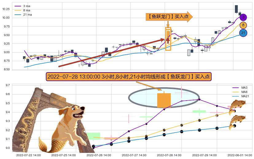 形态多维评估: ⚀ 2022-07-28 13:00:00小时显现 3小时-8小时-21小时均线 【鱼跃龙门】买入点 看多信号,后市看涨,买入