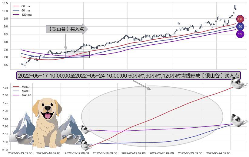 形态多维评估: ⚀ 2022-05-17 11:00:00-小时至2022-05-24 10:00:00-小时显现 60小时-90小时-120小时均线 【银山谷】买入点 看多信号,后市看涨,买入