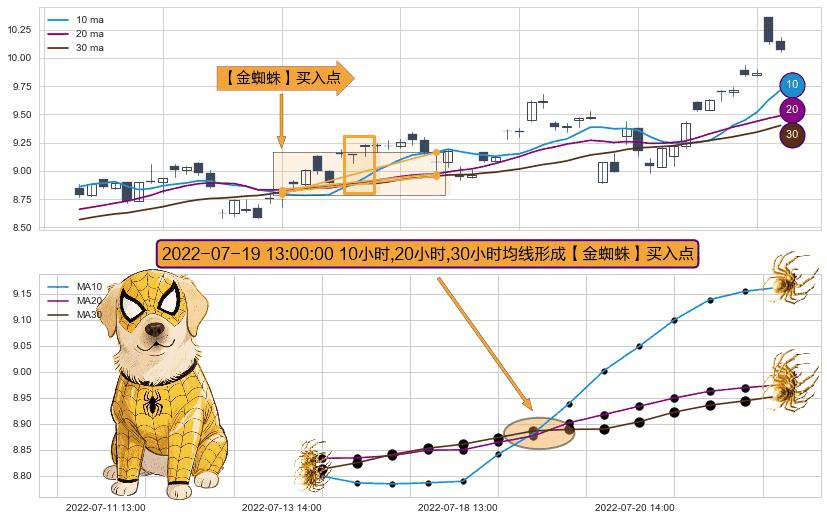 形态多维评估: ⚀ 2022-07-19 13:00:00小时显现 10小时-20小时-30小时均线 【金蜘蛛】买入点 看多信号,后市看涨,买入