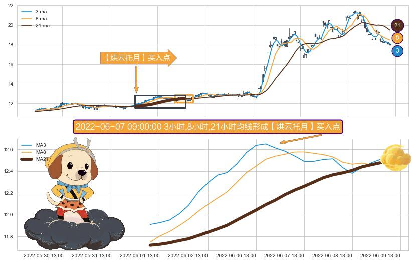 ⚀ 2022-06-01 11:00:00小时-2022-06-09 11:00:00小时显现 3小时-8小时-21小时均线 【烘云托月】买入点 看多信号,后市看涨,买入