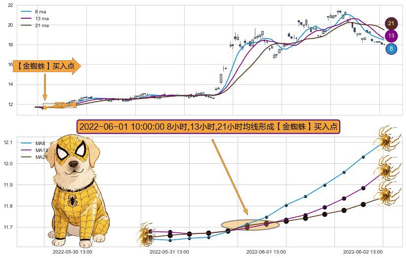 ⚀ 2022-06-01 10:00:00小时显现 8小时-13小时-21小时均线 【金蜘蛛】买入点 看多信号,后市看涨,买入