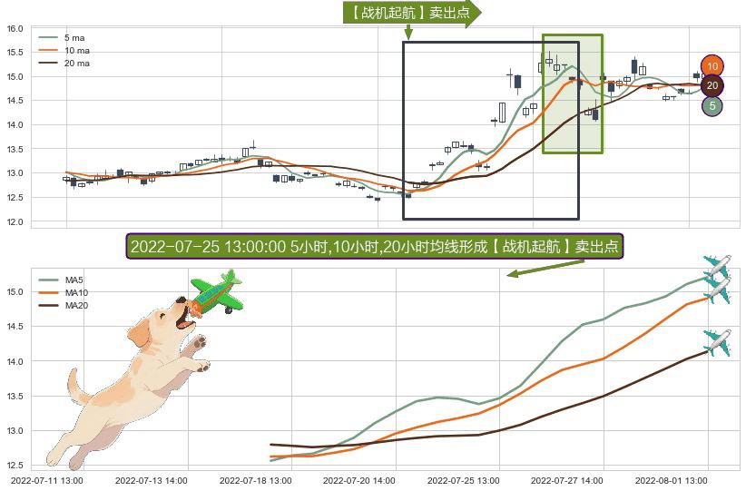 ⚀ 2022-07-15 14:00:00小时-2022-08-01 13:00:00小时显现 5小时-10小时-20小时均线 【战机起航】卖出点 看空信号,后市看跌,卖出