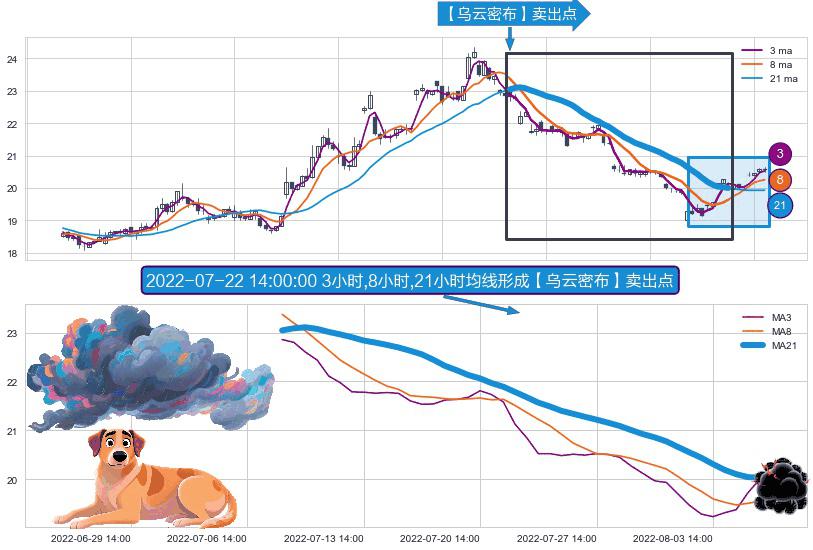 ⚀ 2022-07-08 13:00:00小时-2022-08-09 13:00:00小时显现 3小时-8小时-21小时均线 【乌云密布】卖出点 看空信号,后市看跌,卖出