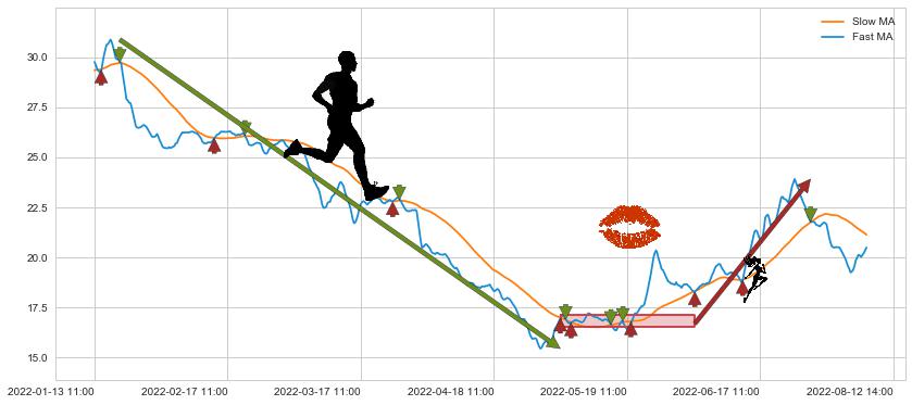 ⚅ 卖点向下突破均线后,价格走势有持续向下的迹象,但动能稍显不足,迟迟不能远离均线
