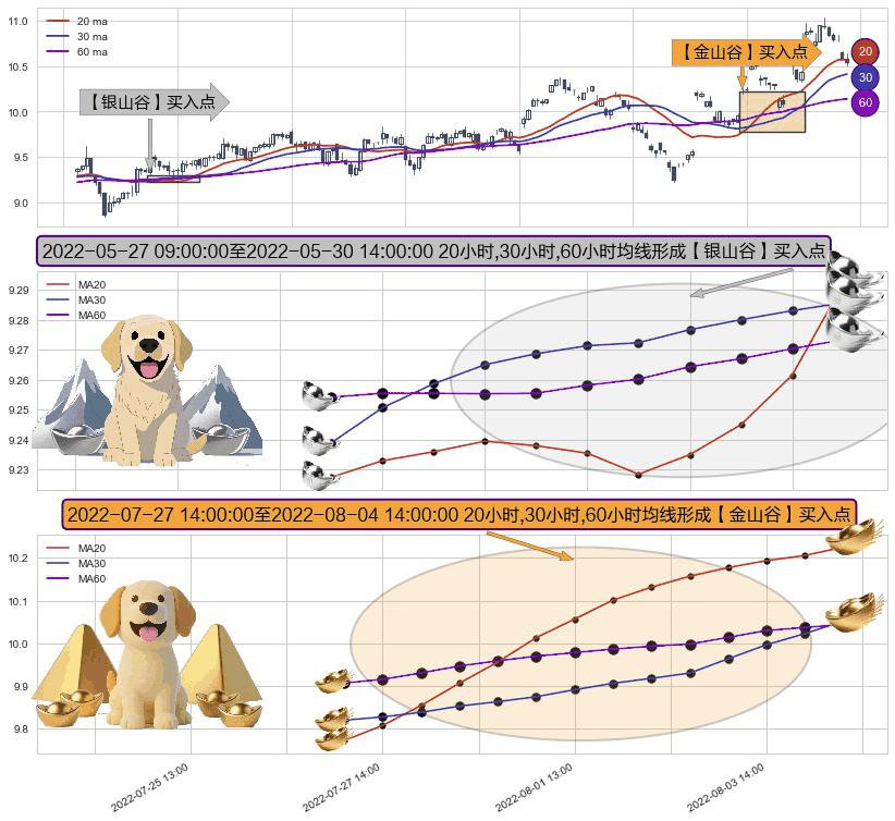 ⚂ 金山谷 高于 银山谷,表明 均线逆转 反弹势头明确,是更强的见底信号更可靠的买入信号