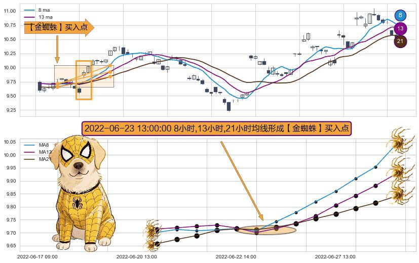 ⚀ 2022-06-23 13:00:00小时显现 8小时-13小时-21小时均线 【金蜘蛛】买入点 看多信号,后市看涨,买入