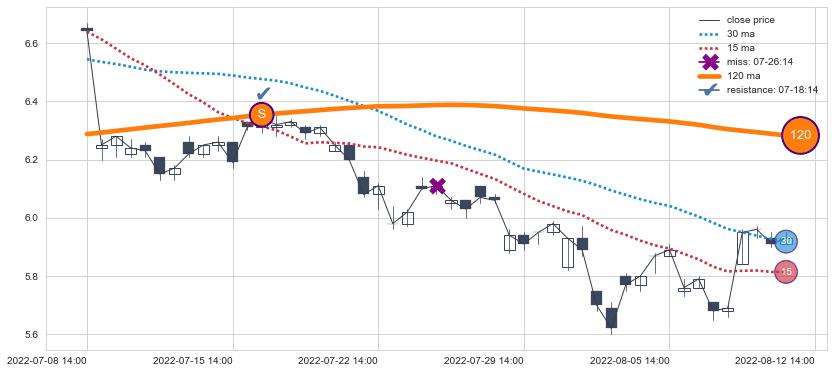 ⚅ 卖点向下突破均线后,价格持续向下走低,向下动能充足,均线斥力助跌效果明显
