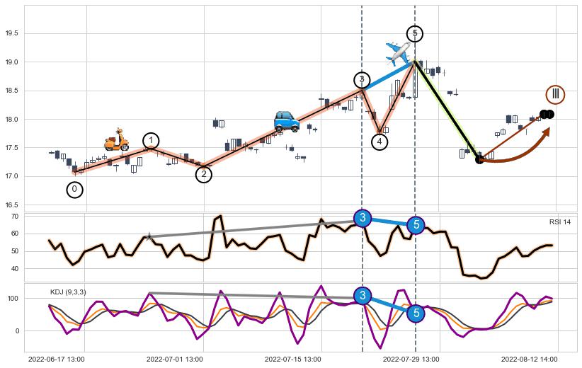 从2022-07-13 14:00至2022-07-22 13:00,共包含14个小时,阶段股价上涨2.76%,阶段股价变动位移路程比: 1 : 5