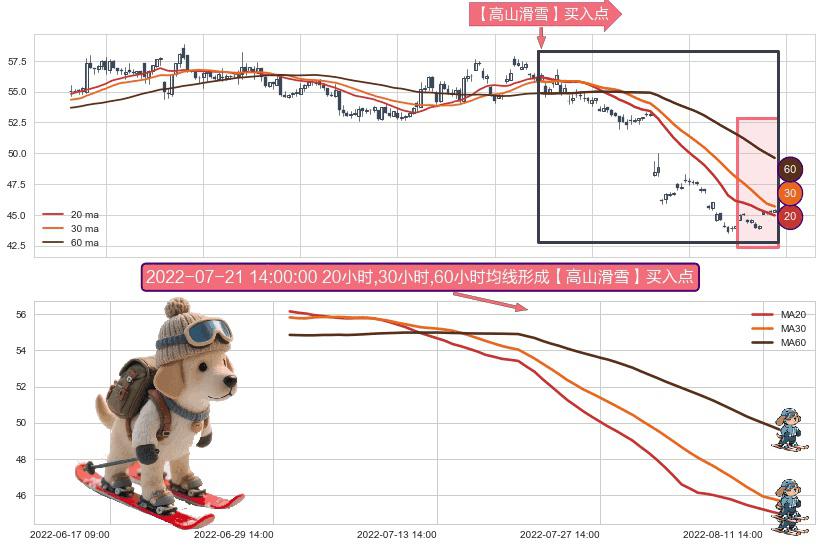 形态多维评估: ⚀ 2022-06-30 14:00:00小时-2022-08-12 14:00:00小时显现 20小时-30小时-60小时均线 【高山滑雪】买入点 看多信号,后市看涨,买入