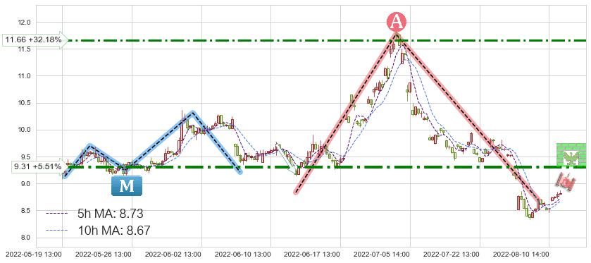 ♘ 阻力价格位11.66,可信任强度57.73%,距离最后交易2022-08-12 14:00形成的收盘价格8.82相差 +32.18%