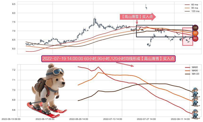 形态多维评估: ⚀ 2022-06-24 14:00:00小时-2022-08-12 14:00:00小时显现 60小时-90小时-120小时均线 【高山滑雪】买入点 看多信号,后市看涨,买入
