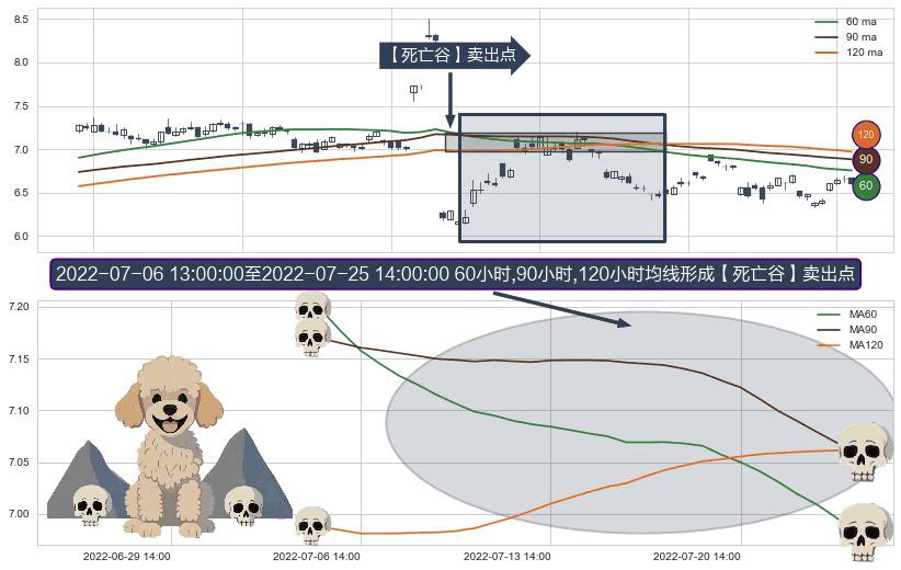 形态多维评估: ⚀ 2022-07-06 14:00:00-小时至2022-07-25 14:00:00-小时显现 60小时-90小时-120小时均线 【死亡谷】卖出点 看空信号,后市看跌,卖出