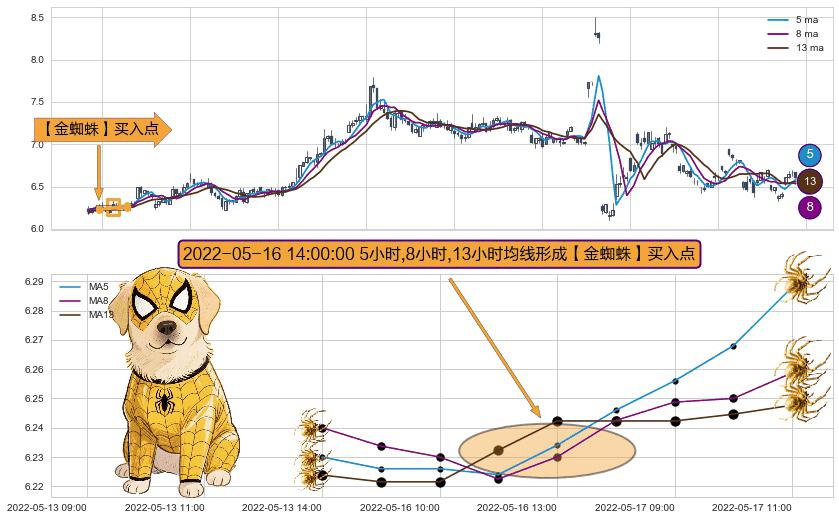 形态多维评估: ⚀ 2022-05-16 14:00:00小时显现 5小时-8小时-13小时均线 【金蜘蛛】买入点 看多信号,后市看涨,买入