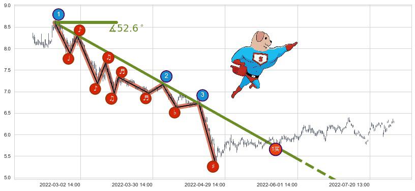 ➣ 2022-02-21 14:00-2022-05-31 14:00下跌趋势存在反转上涨[机会],其原下跌趋势的阻力位(4.18)已被突破[强支撑信号],原下跌趋势角度: 52.6˚