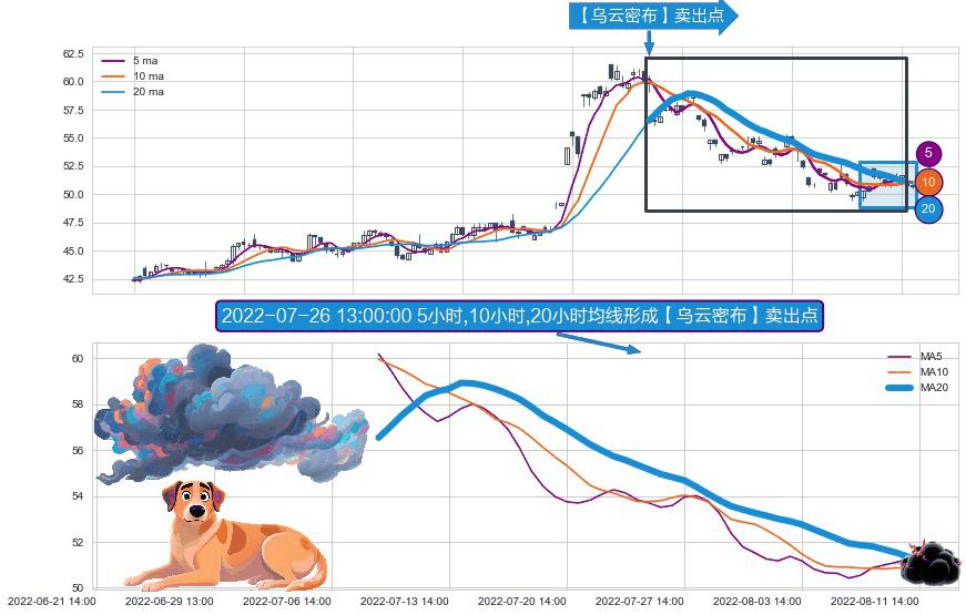 ⚀ 2022-07-08 14:00:00小时-2022-08-11 14:00:00小时显现 5小时-10小时-20小时均线 【乌云密布】卖出点 看空信号,后市看跌,卖出
