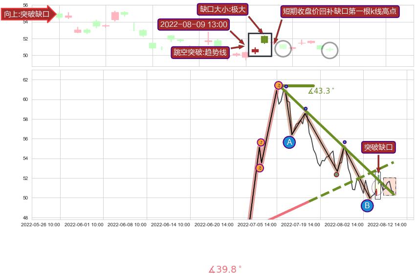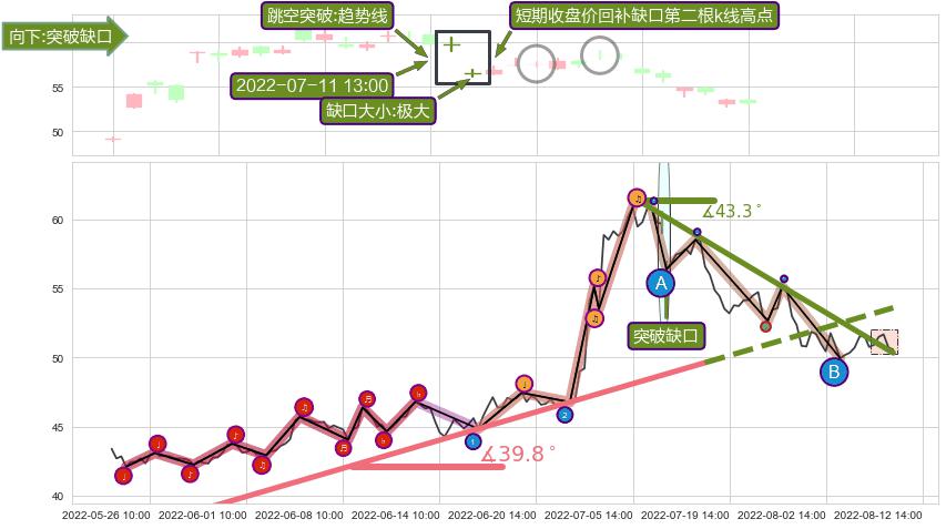 从2022-07-05 14:00至2022-08-11 13:00,共包含52个小时,阶段股价下跌-16.04%,阶段股价变动位移路程比: 1 : 3,下跌趋势角度: 43.3