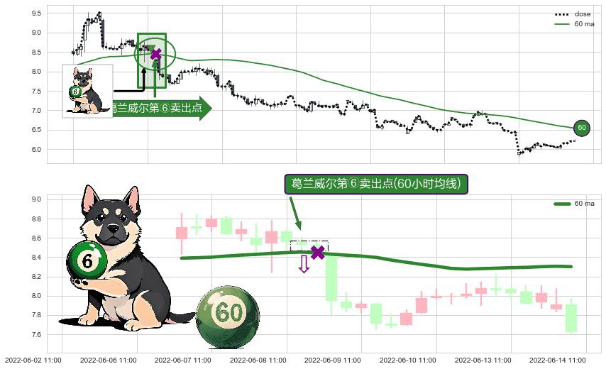 形态多维评估: ⚀ 2022-06-08 13:00:00-小时显现 葛兰威尔均线 60小时均线 第⑥卖出点 走势反转见顶信号,后市看跌,卖出信号