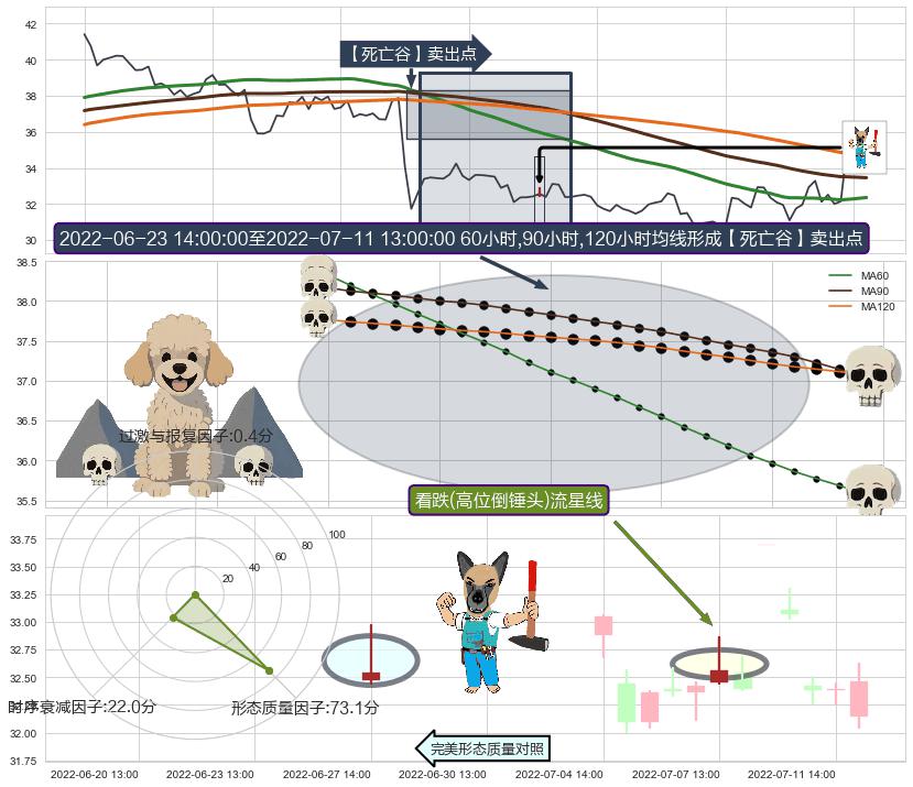 ➣ 2022-06-24 13:00:00-小时至2022-07-11 13:00:00-小时显现 60小时-90小时-120小时均线 【死亡谷】卖出点 看空信号,后市看跌,卖出