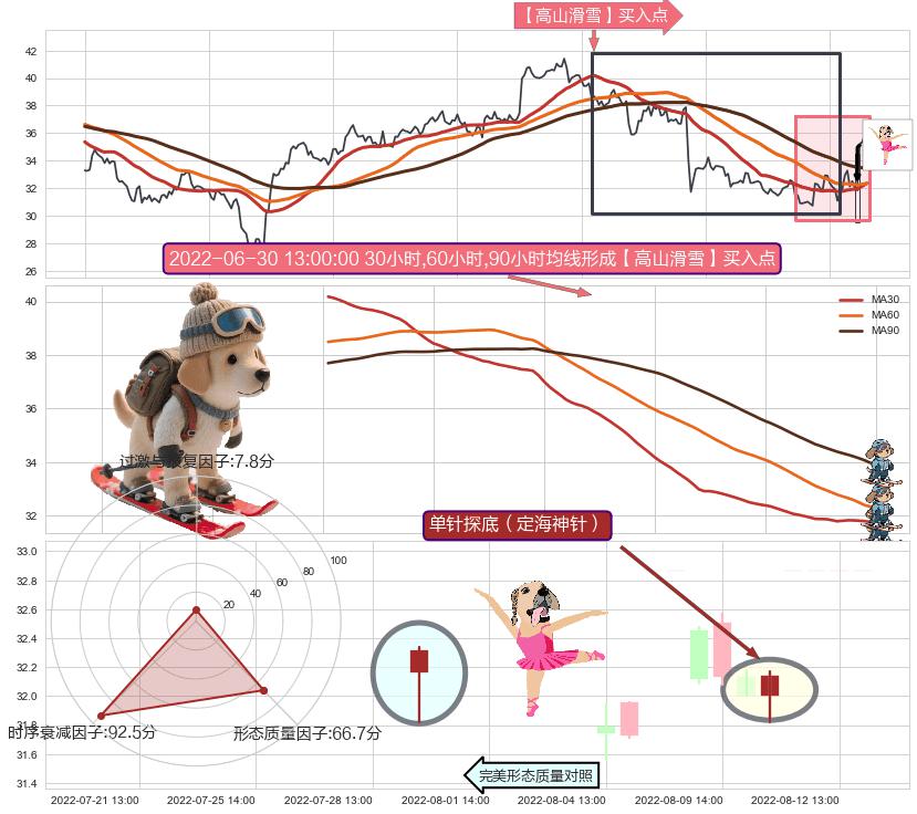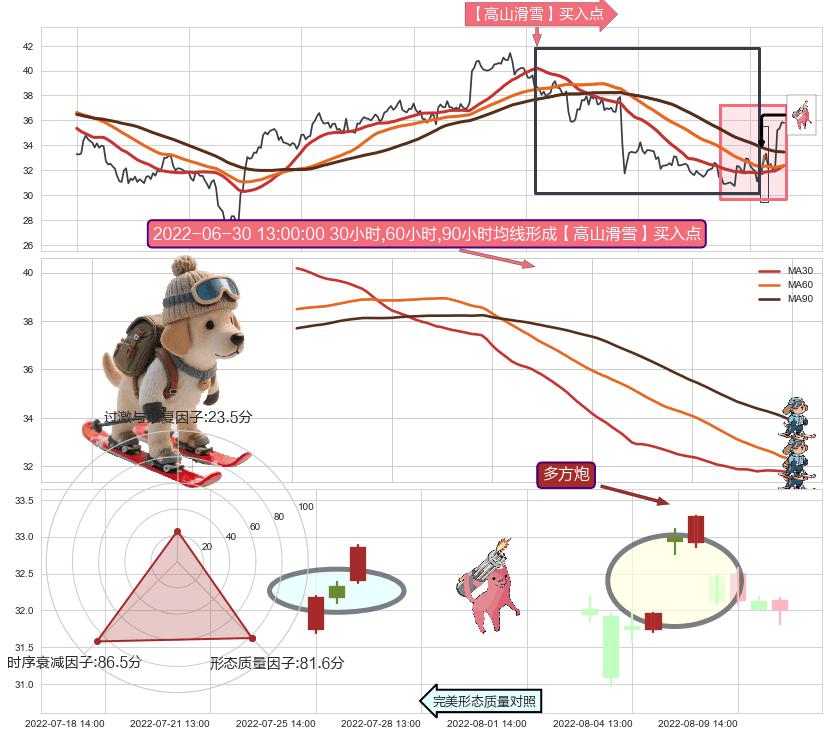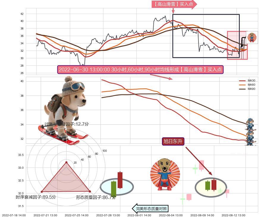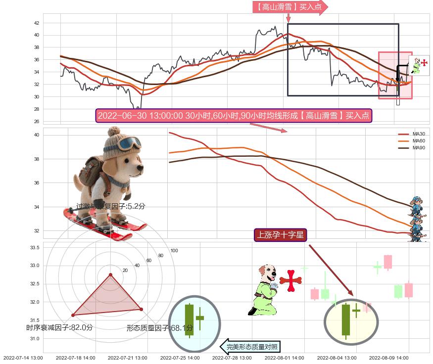 ➣ 2022-06-09 10:00:00小时-2022-08-03 14:00:00小时显现 30小时-60小时-90小时均线 【高山滑雪】买入点 看多信号,后市看涨,买入