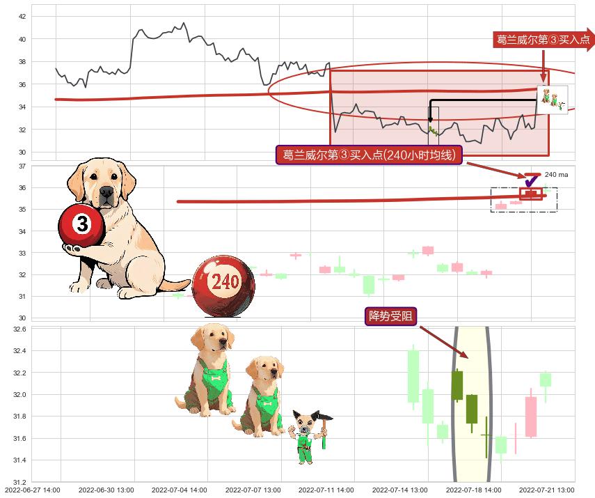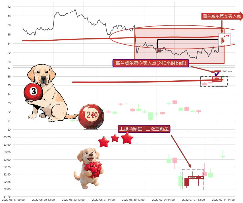 ➢ 葛兰威尔第③买入点:价格重回均线之上 → 均线支撑再次生效 → 反弹上涨 → 葛兰威尔均线第③买入点 → 均线服从信号 → 期望为上涨趋势的中继