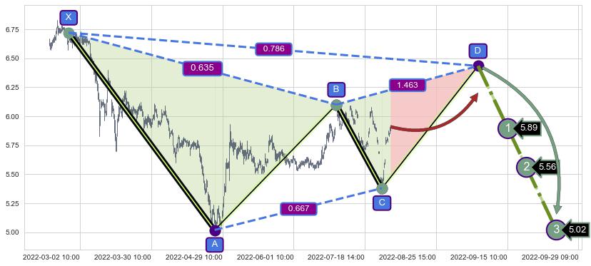 ➢ 距离预测D点位置尚有上涨空间,短线依然【看涨】, 耐心等待看跌【伽利】形态反转启动
