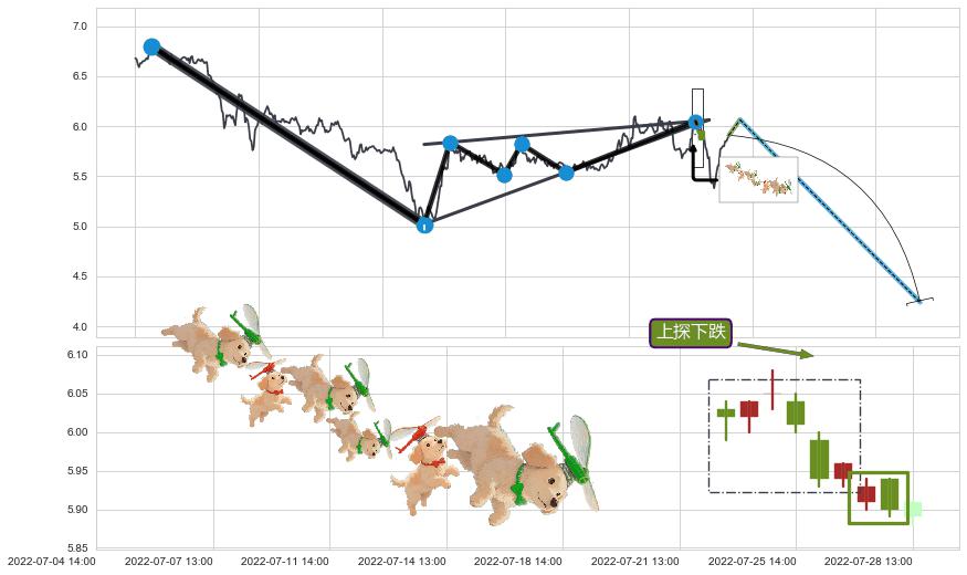 ➢ 低点影线(06-23:13: 5.89 )→再次回踩→第一根k线高点(06-17:14: 5.91 )